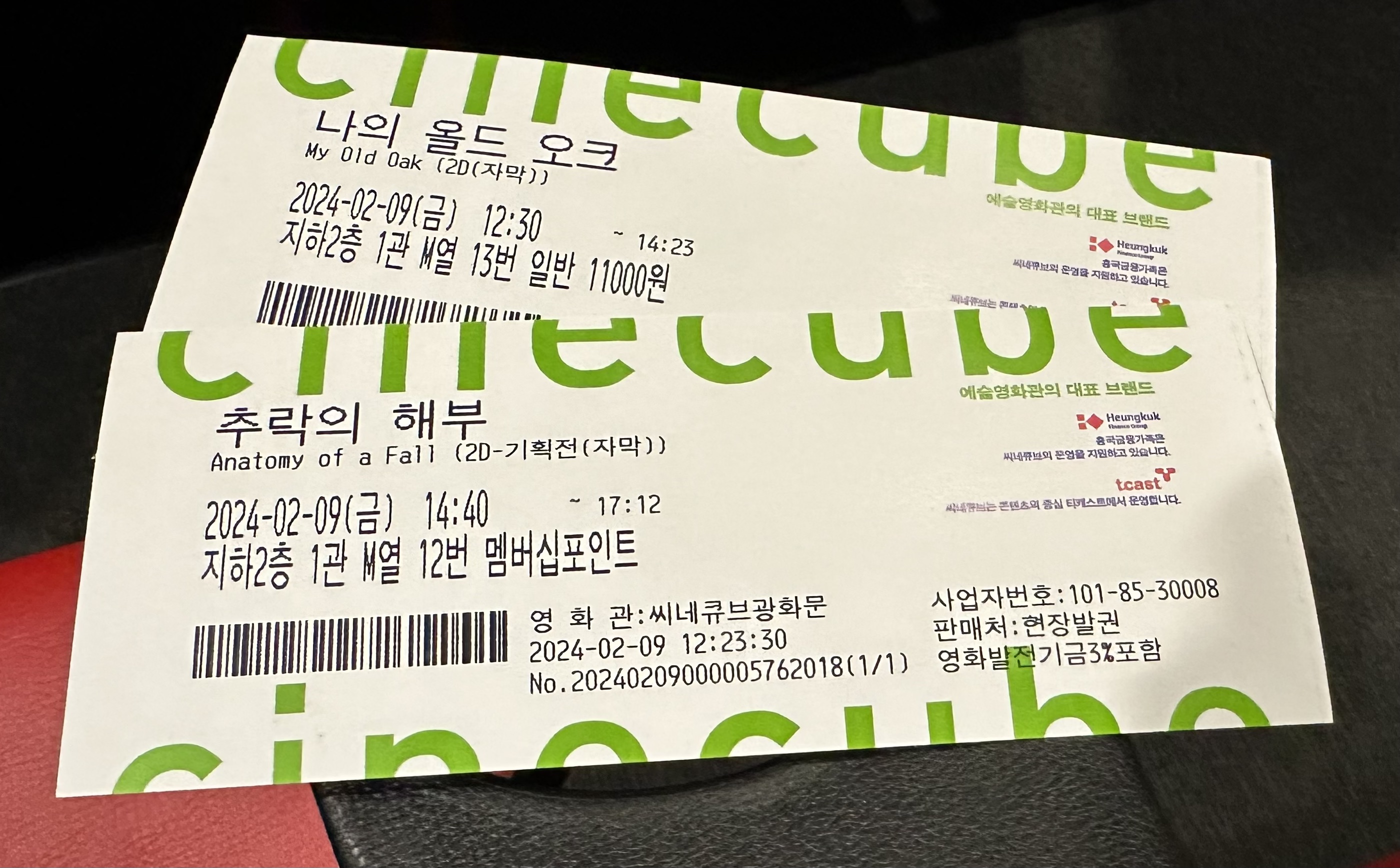 설 연휴 첫날 광화문 씨네큐브에서 두 편을 보는 영화 Day(12/9/23)를 보냈다. <추락의 해부>를 보러 갔다가, 이왕 나가는 김에 한 편 더 보기로 한 것이다. 2월 생일 쿠폰으로 한 편은 공짜로 봤는데^^, 다른 데보다 좋은 영화를 저렴하게 볼 수 있는데다가 멤버십 포인트까지 적용 받으니, 신났다. 물론 20분 간격으로 연이어 보는 건 지적으로나 신체적으로나 중노동이었지만 말이다.