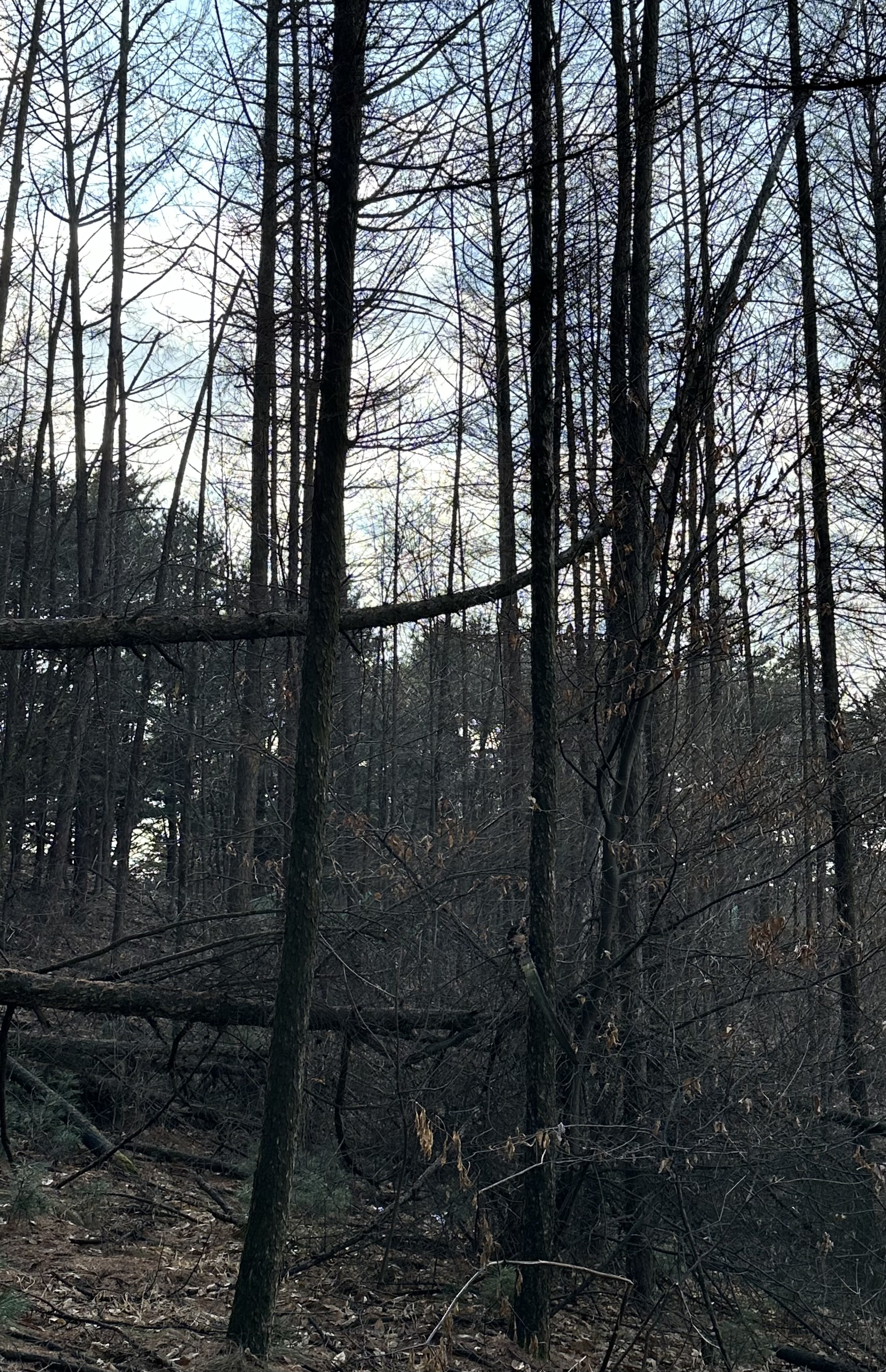 가만히 살펴보니 기울거나 쓰러진 나무들의 수평 각도에 따라 높이가 결정되는데, 길가에서 기울기가 작은 것들은 바리케이드처럼 쓰러져 있고, 기울기가 제법 되는 것들은 곁에 있는 나무들 여럿의 신세를 지면서 중간 높이까지 진출해 있었다. 쓰러진 친구들을 위해 곁을 내주면서 함께 풍경을 이루고 있는 나무들의 우정이 아름답다.