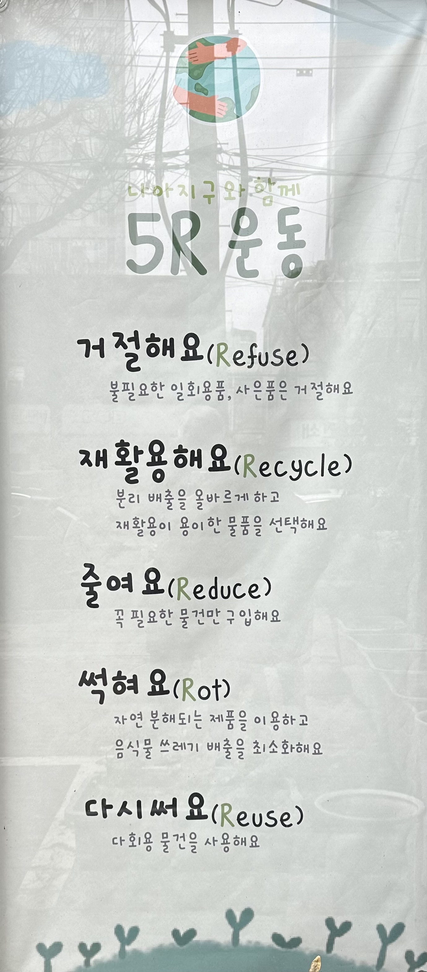 나아지구란 환경운동 가게는 5R이란 환경운동 슬로건이 눈에 띄었는데, 다른 R은 많이 봤지만 Rot(썩혀요)는 잘 못 보던 거였는데, 뜻을 알고나니 고개가 끄떡여졌다. 거창한 건 못해도 이런 5R이라면 기꺼이 동참할 수 있고, 그래야만 할 것이다. 날이 좀 따뜻해지면 가게 안으로 들어가 뭐가 있는지 구경하려 한다.