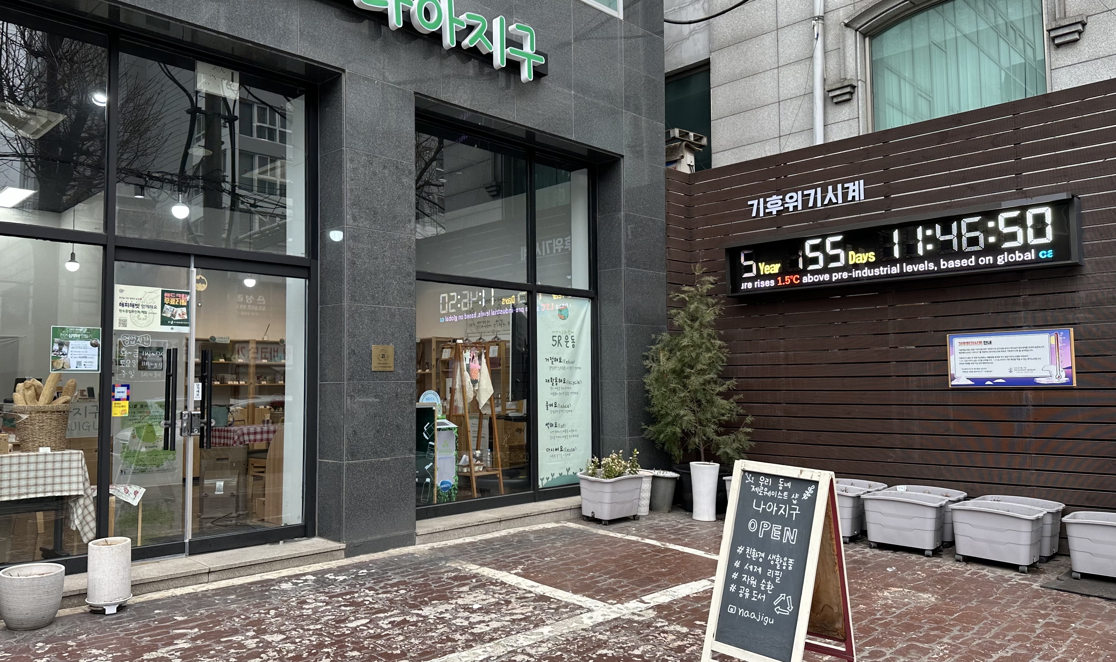 주일예배를 마치고 근처에 있는 중부시장엘 잠깐 들렸는데, 가는 길에 환경운동을 하는 가게가 보였다. 벽면의 기후위기시계 전광판은 5년 55일 11시간 46분 50초를 가리키고 있었다. 안내판을 보니, 전세계 이산화탄소 배출량을 토대로 지구 평균기온이 산업화 이전보다 1.5도 오르기까지 남은 시간이란다.