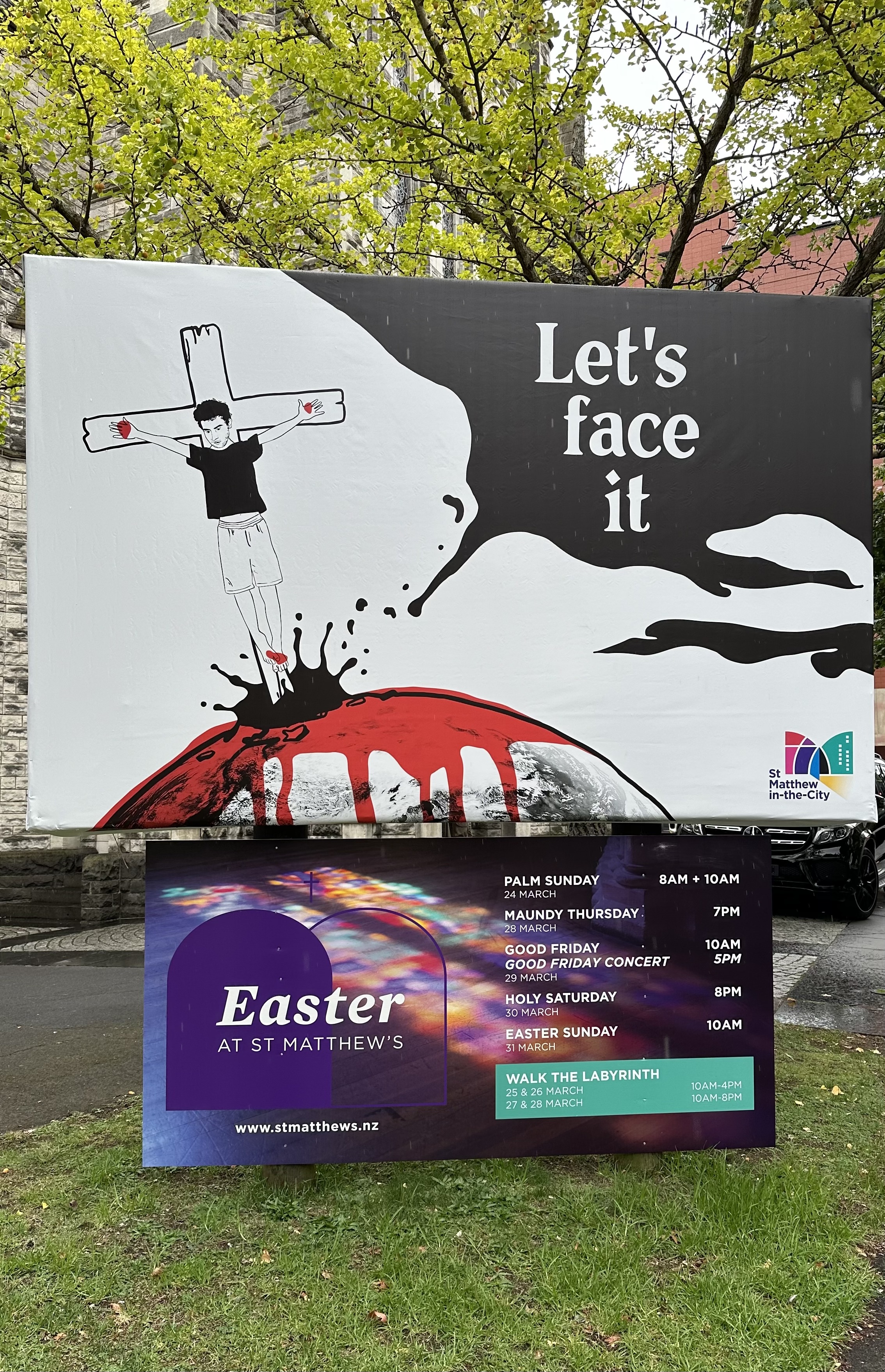 그때가 부활절까진 딱 두 주 전이었는데, 십자가와 부활을 알리는 그림과 "직면하라"는 카피가 인상적이었다. 2천년 전이나 지금이나 부활은 외면하고 싶지 직면하기 참 어려운 일인데, 종려주일과 성 금요일 그리고 부활절 예배 시간에의 초대로 지나다니는 사람들의 주의를 점잖으면서도 강하게 일깨우려는 노력이 가상해 보였다.