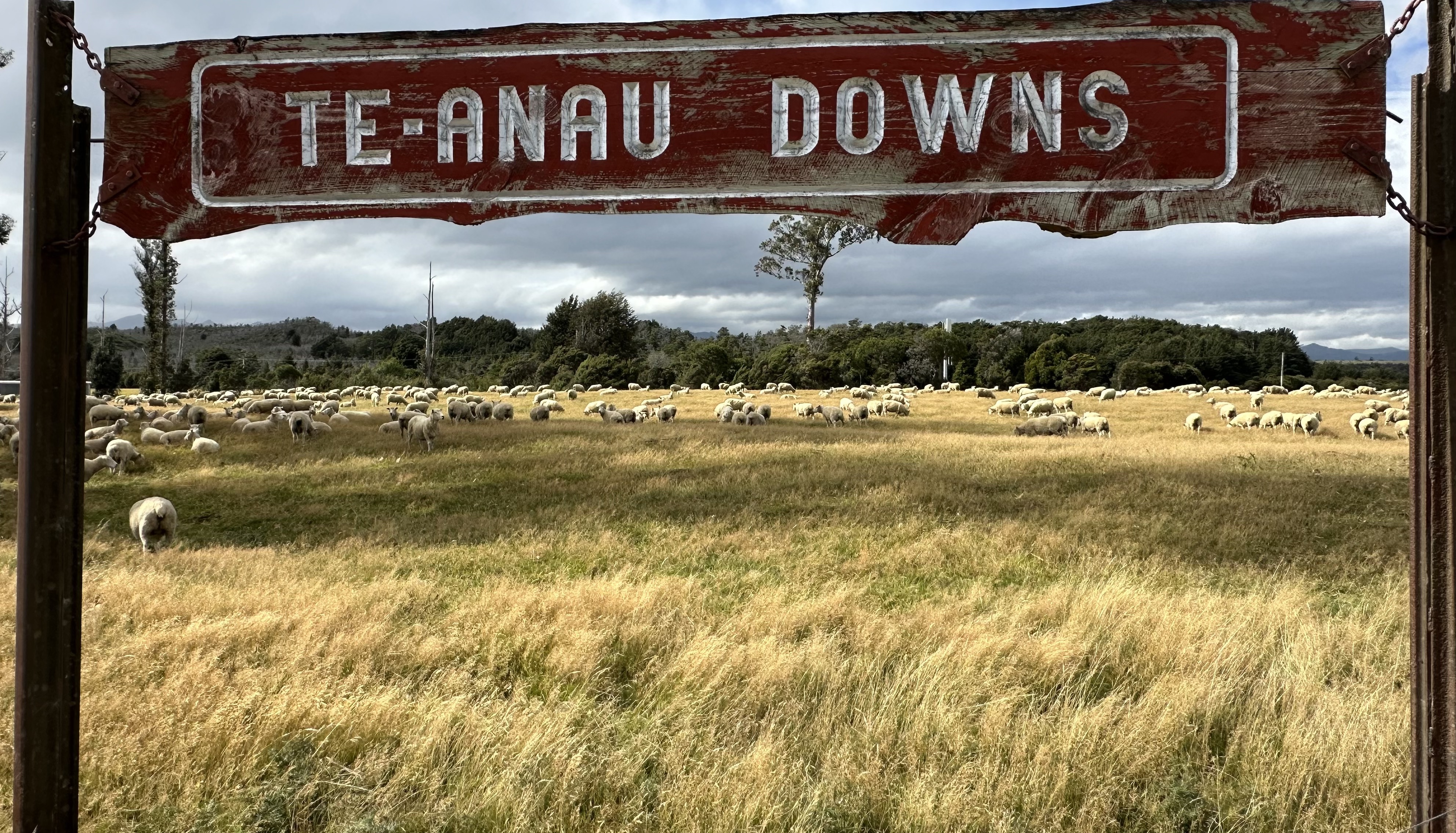그러다가 이번에 남섬을 여행하다가 테 아나우 가는 길에 주차가 가능한 길가에 차를 멈추고 실컷 구경할 기회를 갖게 됐다. 나도 가까이에서 보고 싶었지만, 동병상련의 일행들도 좋아라 한 순간이었다. 게다가 이 목장의 웨스턴 스타일 고풍스런 목재 간판까지 넣어 사진을 찍을 수 있었으니, 오랜 소원 중 하나를 이뤘다.