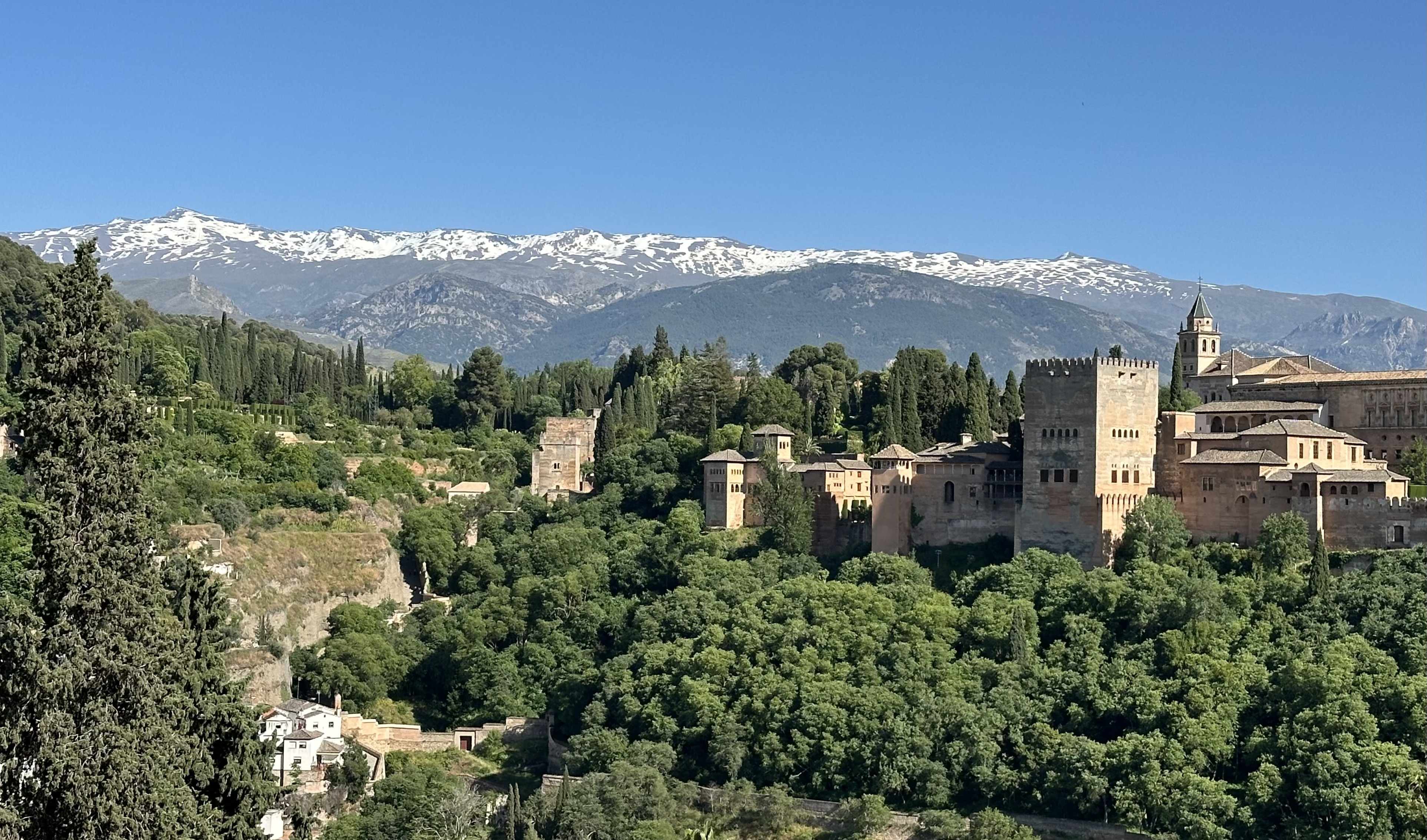 알함브라를 너댓 시간 둘러보고 나오려는데, 한쪽에 설산이 펼쳐 있었다. 시에라 네바다 산인데, 뜻도 '눈 덮인 산맥'인 3천 미터대의 고봉들로 최고봉은 3,478m란다. 오후 늦게 알바이신 언덕에 올라 알함브라와 시에라 네바다를 한눈에 영접할 수 있었다.