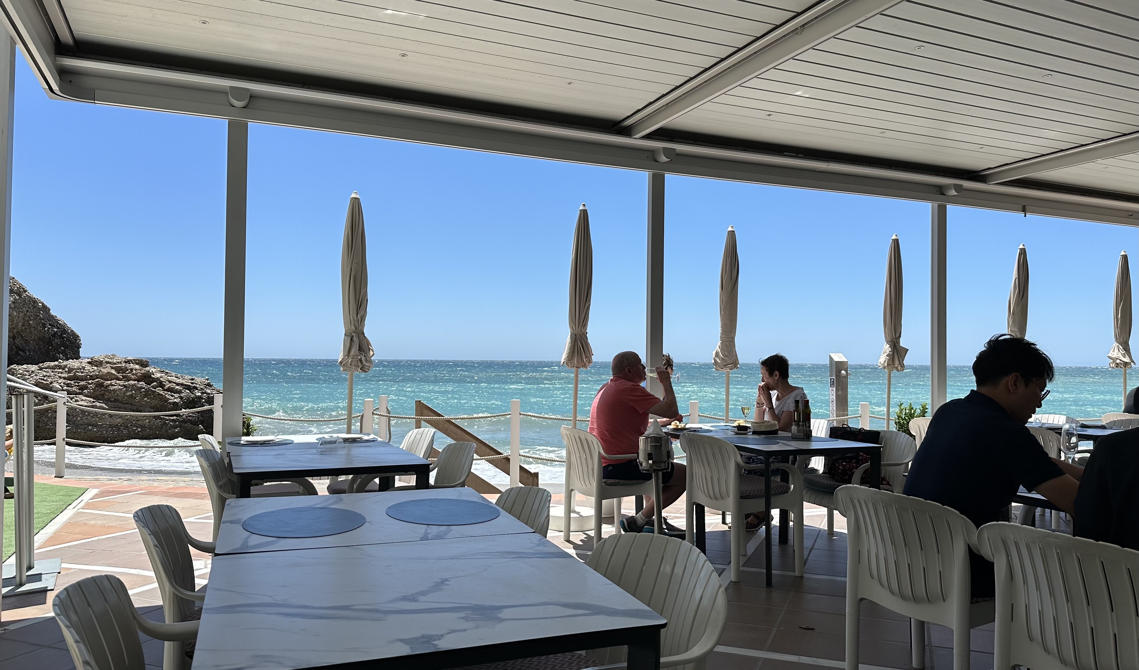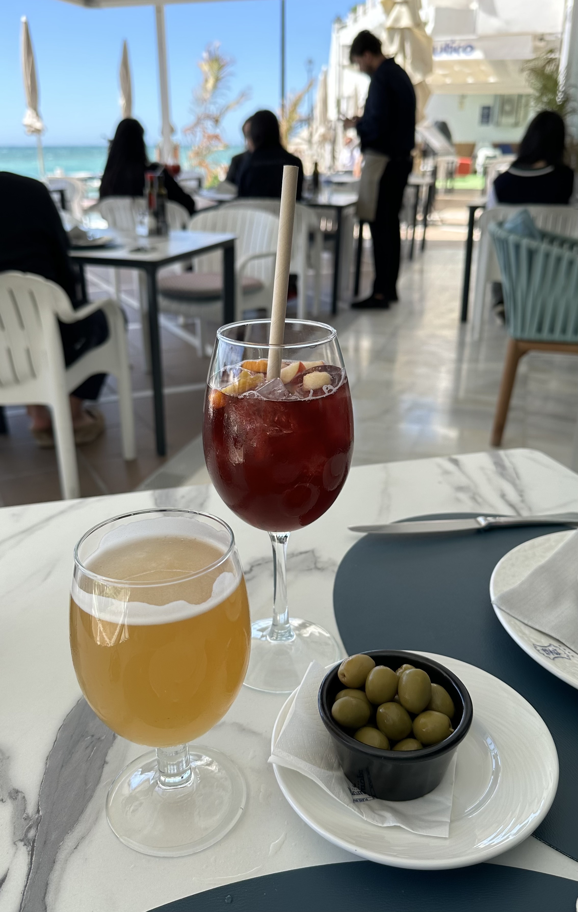 바다가 눈앞에 펼쳐지는 레스토랑에서 점심을 먹었다. 스페인은 우리와 달리 물을 주지 않고, 드링크-스타터-메인-디저트 식으로 주문하는데, 두 주 내내 샹그리아(화이트, 레드, 로즈 다 있다)나 레몬 비어(Limon Clara)가 피로를 달래주었다. 기본 안주(오토시) 격으로 나오는 올리브는 모든 식당이 다 주지는 않지만, 하나 같이 맛있었다.