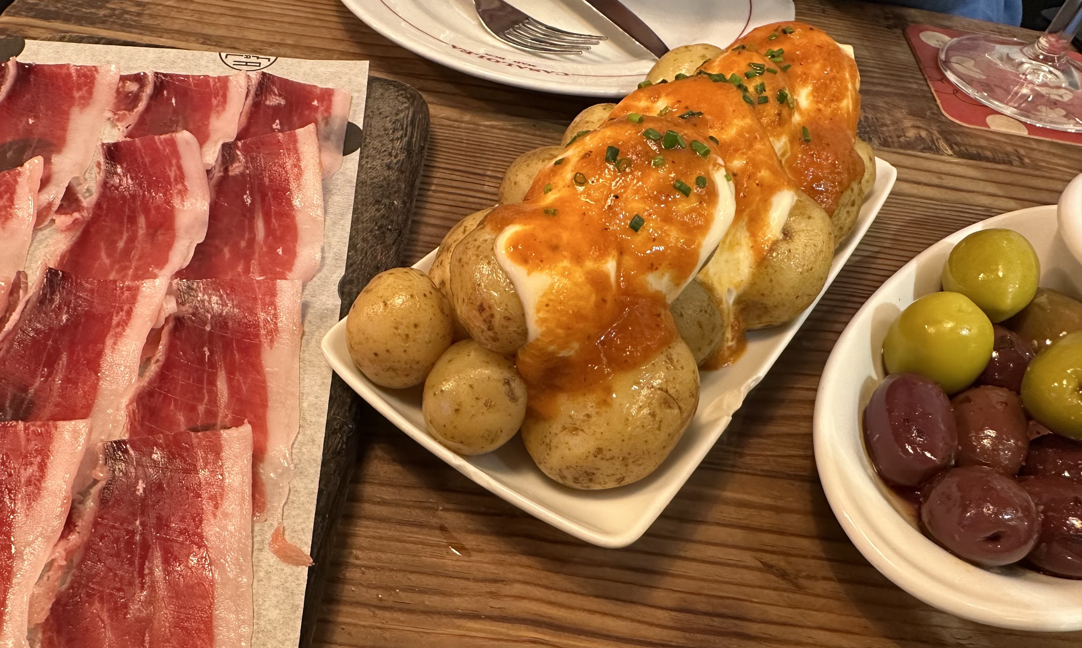 자체 브랜드로 나오는 화이트 와인 상그리아부터 상큼한 게 입맛을 돋우웠고(귀국하는 마드리드 공항 면세점에서 이 병이 보이길래 사 왔다), 두 종류의 올리브, 올리브유 듬뿍 두른 멸치보다 큰 엔쵸비, 부드럽고 살살 녹는 하몽(이베리아 햄), 치즈와 소스를 얹은 감자가 우리 입맛에도 딱 맞는 걸로 봐서, 어떤 메뉴든지 다 괜찮을 것 같았다.