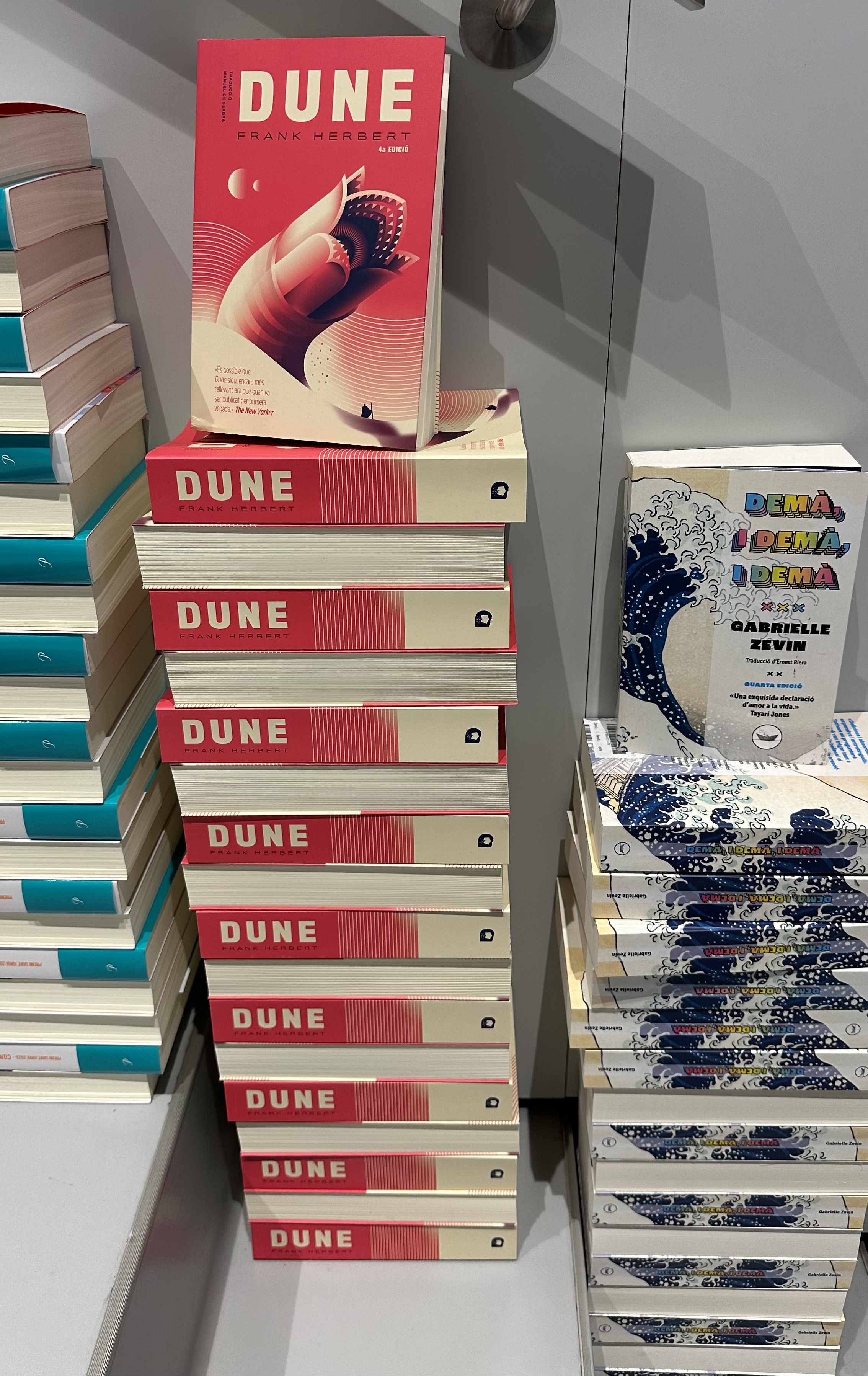책을 우리처럼 책꽂이에 가득 꽂기보다는 가능하면 표지가 보이도록 진열하고, 신간과 베스트 셀러들은 벽면에 십여 권씩 쌓아 놓아 구경하는 이들을 가가이 오게 해 한 권씩 집어들게 만들고 있었다. 대부분 스페인어 책들인지라 표지 디자인 중심으로 훑어봤는데, 영화로도 개봉된 <Dune>이 보여 반가웠다.