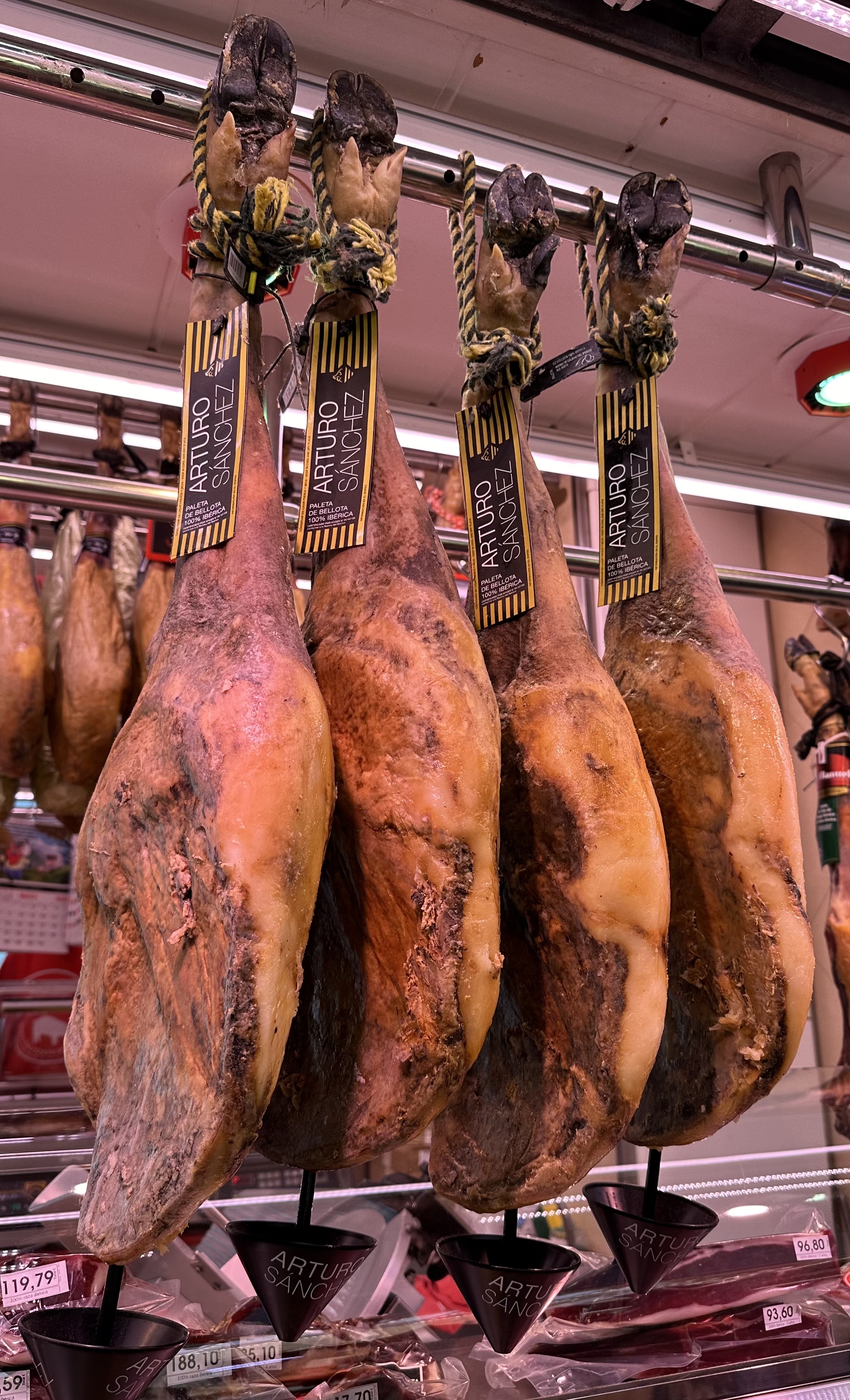 보케리니 시장에서 가장 많은 비중을 차지하는 건 역시 스페인의 자랑 하몽(Jamon)이다. 염장해 숙성시킨 돼지 뒷다리들은 천장에 고리를 걸어 늘어놓는 것만으로도 권위를 입는다. 저 풍성하고 두툼한 살점들을 썰 때는 비취는 종이처럼 얇게 깎듯 펼쳐 내는데, 이미 비주얼에서 한 수 접고 들어가게 만든다. 여러 급이 있다는데, 어설픈 여행객이 욱안으로 구별하는 건 무리겠고, 그저 즐겁게 먹어줄 입만 챙기면 된다.