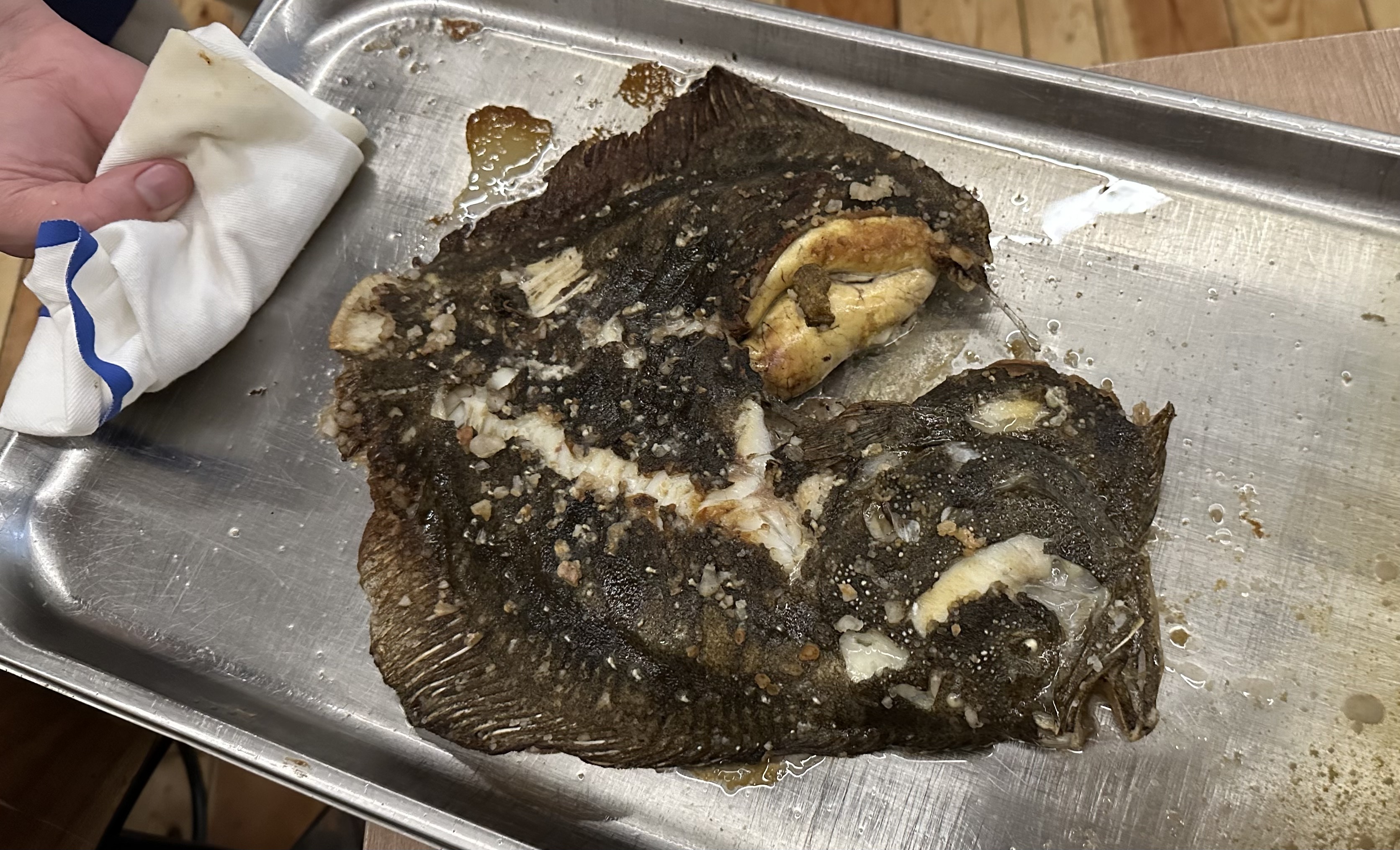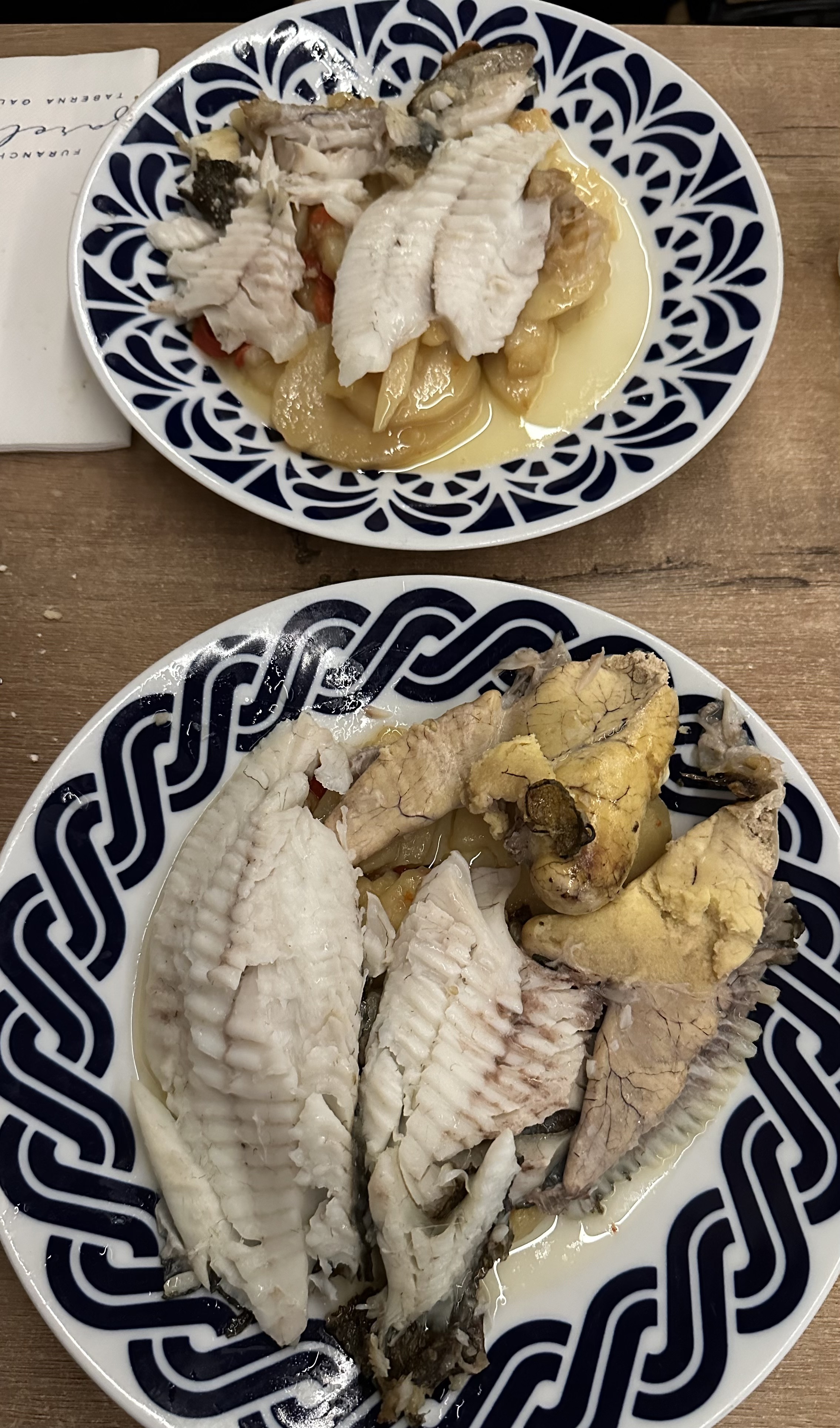 메인은 스테이크나 양고기로 갈 생각이었는데, 오늘의 생선이 괜찮다는 웨이터의 말에 시켜봤다. 시킬 땐 몰랐는데, 오븐에 조리가 된 걸 가져왔는데 양손바닥 크기로 넓적한 게 광어나 가오리 쯤 돼 보였다. 다시 가져가더니 두 접시에 먹기 좋게 살을 발라 내왔다. 생선살은 담백하고, 알인지 내장인지 제법 큰 덩어리들은 고소했다. 이 생선요리만 10만원 정도 받았는데, 음~ 미슐렝이니까.
