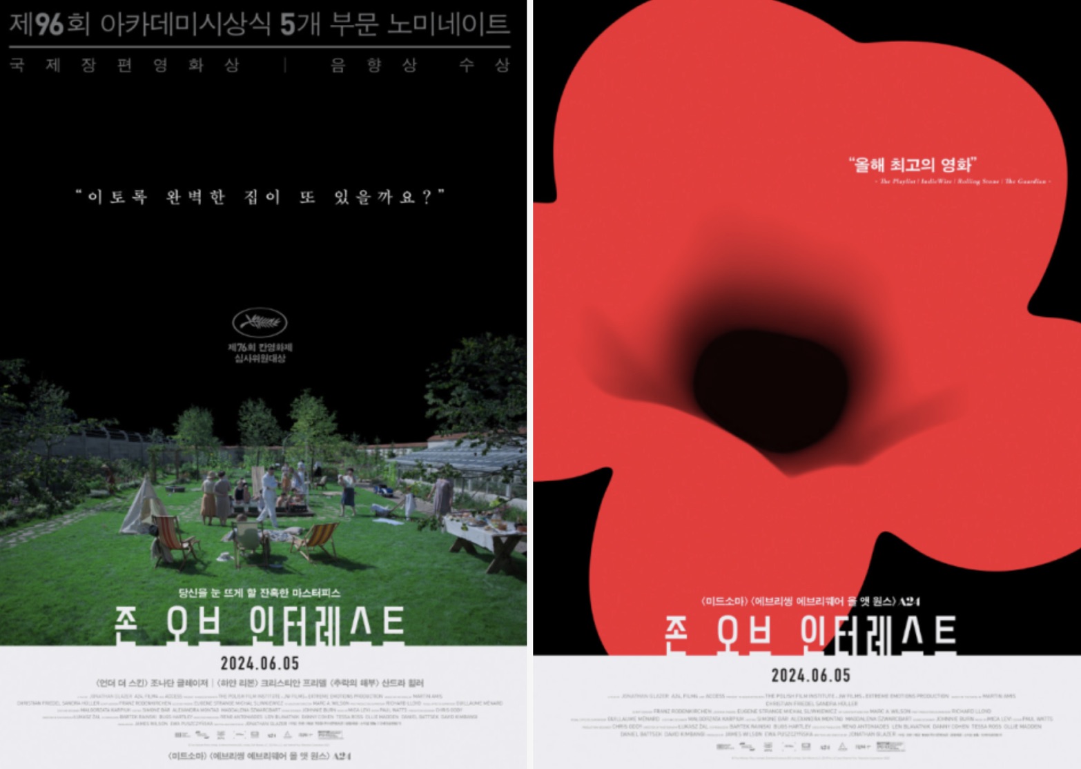 작년 칸 영화제에서 그랑프리를(대상 격인 황금종려상은 같은 여배우 산드라 휠러가 열연한 <추락의 해부, 2/21/24>), 올해 아카데미 국제장편영화상을 수상한 화제작 <존 오브 인터레스트>를 개봉 다음날 봤다. 두 개의 포스터 중 극장 사이트들은 강렬한 이미지 때문인지 오른쪽 것을 내세웠는데, 내용으로 봐서는 왼쪽 것이 어울려 보이기도 한다.
