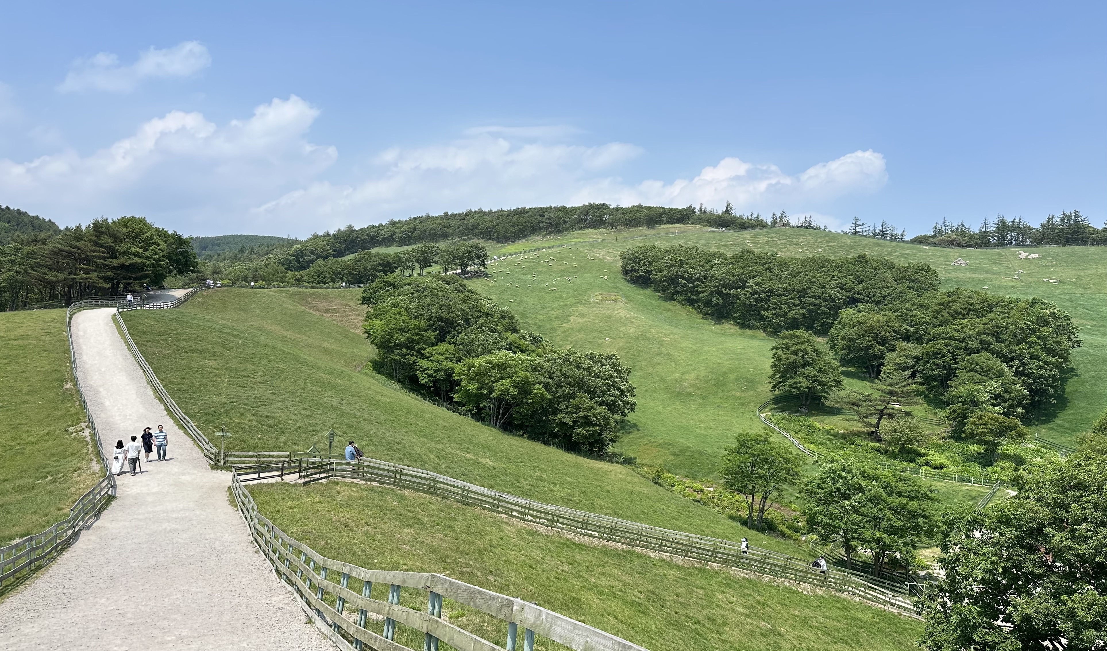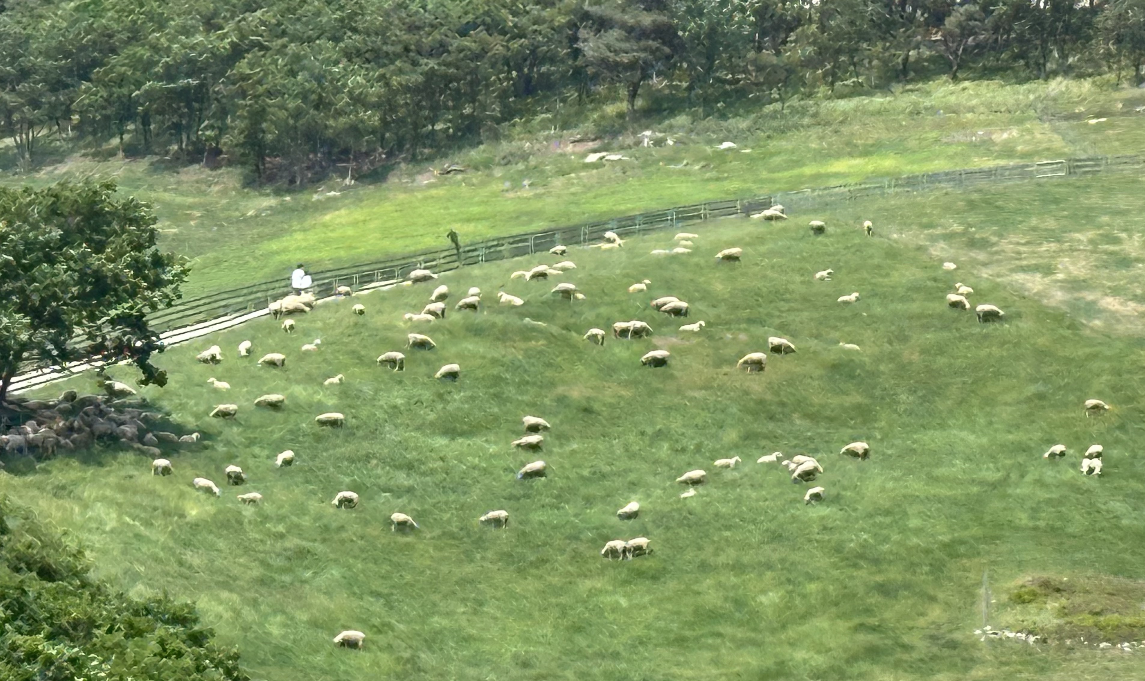 얼추 2백여 마리 양떼들이 풀을 뜯고 되새김질하는 한가하고 유유자적한 그림 같은 풍경이 저 멀리 언덕에서 펼쳐지고 있었다. 두어 달 전 뉴질랜드 남섬 테 아나우(5/9/24)에서 본 목장의 양떼들과 규모는 비교되지 않아도 풍경이 좋고, 목책 바로 앞까지 가까이 다가가 지켜볼 수 있어 입장료(9천원)가 아깝지 않았다.