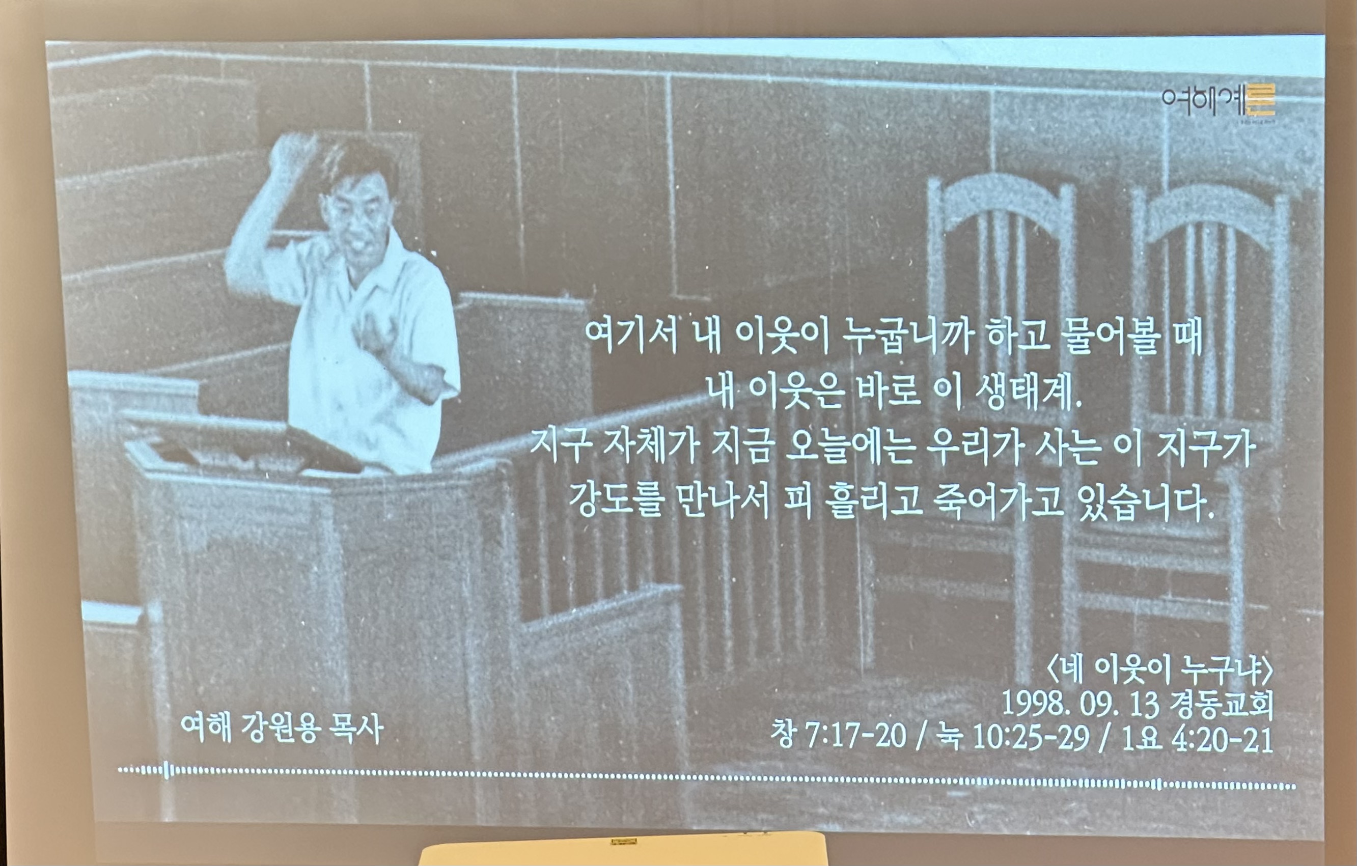 해방되던 해에 설립된 우리교회가 80주년을 맞아 이런저런 행사를 하고 있는데, 가을 석 달 간은 장공 김재준 목사와 함께 교회 주춧돌을 놓고, 오랫동안 목회자와 시회 지도자로 영향을 끼쳤던 여해 강원용 목사 관련 포럼(여해 포럼)을 열고 있다. 첫 시간은 이 교회에서 어릴 때부터 자라 목사가 된 강사 셋이 그의 신학과 목회를 회고하는 시간이었다.