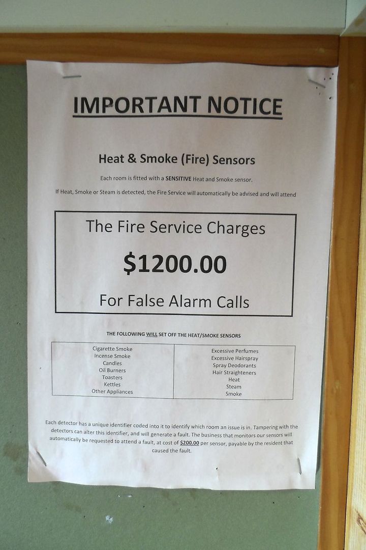 코스타 기간 동안 머문 와이카토 대학 기숙사는 방마다 책상 위에 시설 안내 브로셔와 함께 중요한 공지사항을 붙여 놓는다. 7년 전 처음 갔을 땐 뭐 이런 것도 경고하나 싶었는데, 혈기왕성한 젊은 친구들에게 화재 예방과 경보는 당연히 반복해서 강조할 일이겠다 싶다. 다행히 제법 쎄 보이는 벌금 액수는 그대로(11/29/12)인 걸 감사해야 하나.^^