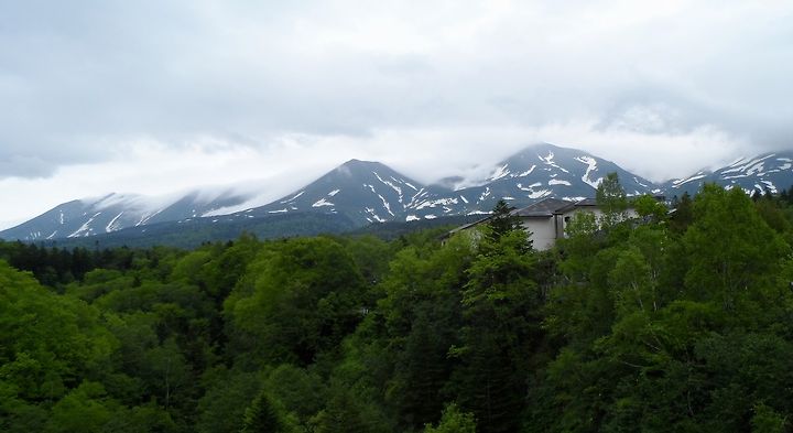 2천 미터쯤 되는 봉우리들이 연이어 병풍처럼 펼쳐지는 이 산은 다이세쓰산계(大雪山系)인지 도카치다케(十勝岳) 봉우리들인지, 아니면 둘이 같은 건지 정확한 이름은 모르겠지만, 어차피 지금 트레킹 할 것도 아니므로 이름은 그리 중요하지 않았다. 6월에도 이 정도의 설경을 보여주는 산세라면 1-2미터 이상씩 눈이 내린다는 한겨울엔 산이며 도로며 대단하겠다 싶었다. 역시 어느 동네를 가든 산은 보는 것만으로도 즐겁고 가슴을 뛰게 만든다.