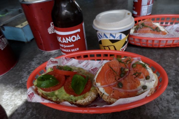 매장 안엔 테이블이 없고 베이글 만드는 주방과 카운터, 냉장고만 있고, 여럿이 적당히 합석하는 긴 테이블이 밖에 놓여 있었다. 다양한 베이글과 토핑을 올린 메뉴들이 적혀 있었는데, 늘 그렇듯이 폴이 알아서 주문하는 동안 매장 안팎을 둘러본 후, 밖에서 자리 잡고 앉아 곧 나올 오클랜드에서의 마지막날 아침식사를 기대하며 기다렸다.