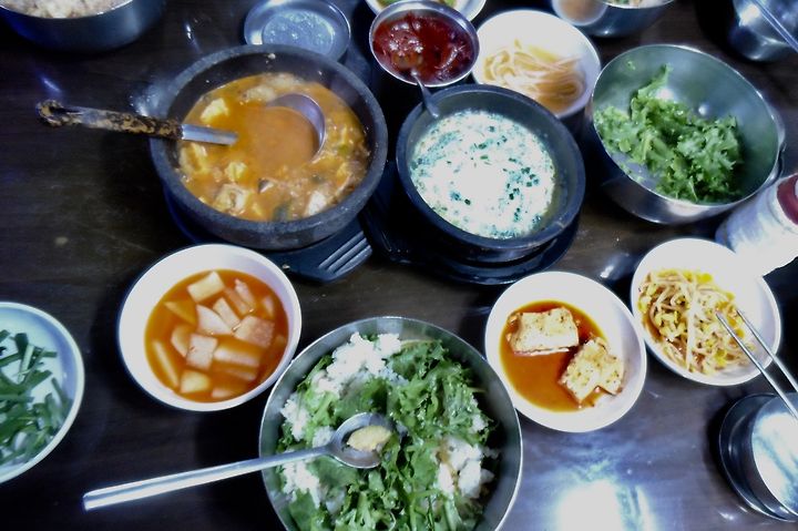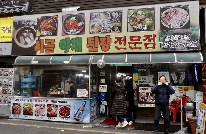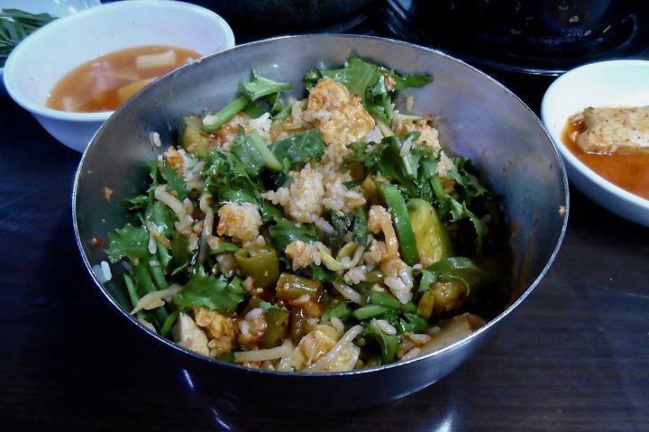 요즘 거의 매주 가는 식당이 있는데, 강남역 사랑의교회 건너편에 있는 밥집이다. 오래 전부터 있던 식당인데 1번 메뉴가 한결 같아서 그 맛에 찾는 이들이 적지 않은 곳이다. 그 사이 값은 조금씩 올라 지금은 8천원을 받는 시골야채된장비빔밥이 시그니처 메뉴인데, 상호도 그 이름 대로다. 테이블에 쌓여 있는 빈 대접에 공기밥을 덜어 잘게 썬 상추와 부추를 양껏 넣고 무채와 콩나물 무침을 넣고 고추장과 참기름을 넣고 있으면 바로 뚝배기 두 개가 나온다.