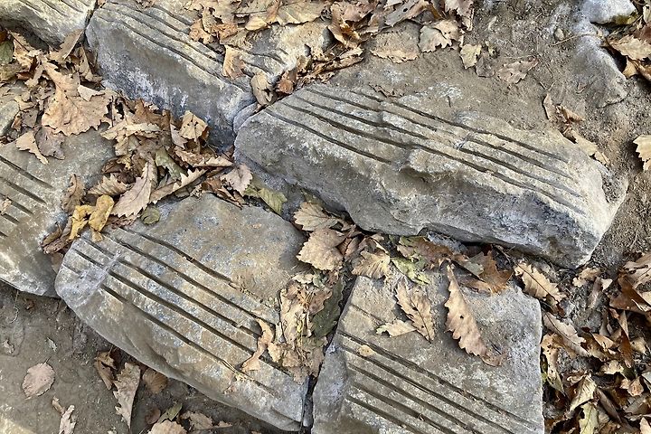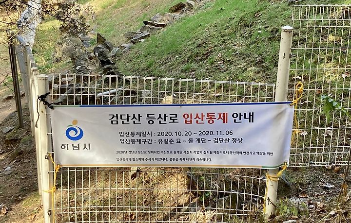 10월 말에 다시 검단산을 오르는데, 유길준 묘역 펜스에 같은 내용의 현수막이 걸려 있었다. 입산 통제라 써 있지만, 아주 본격적인 정비는 아닌지 올라가지 못하게 막아놓지는 않아 정상까지 가는 데는 별다른 어려움은 없었다. 뭘 정비하나 궁금했는데, 길게 이어지는 돌계단을 오르내리기 편하도록 발판 쪽을 몇 줄로 깎아 홈을 내는 미끄럼 방지 작업을 하고 있었다. 기계로 돌을 깎는 소리가 요란했고, 뿌연 돌먼지가 가볍게 날리는 정도였다.