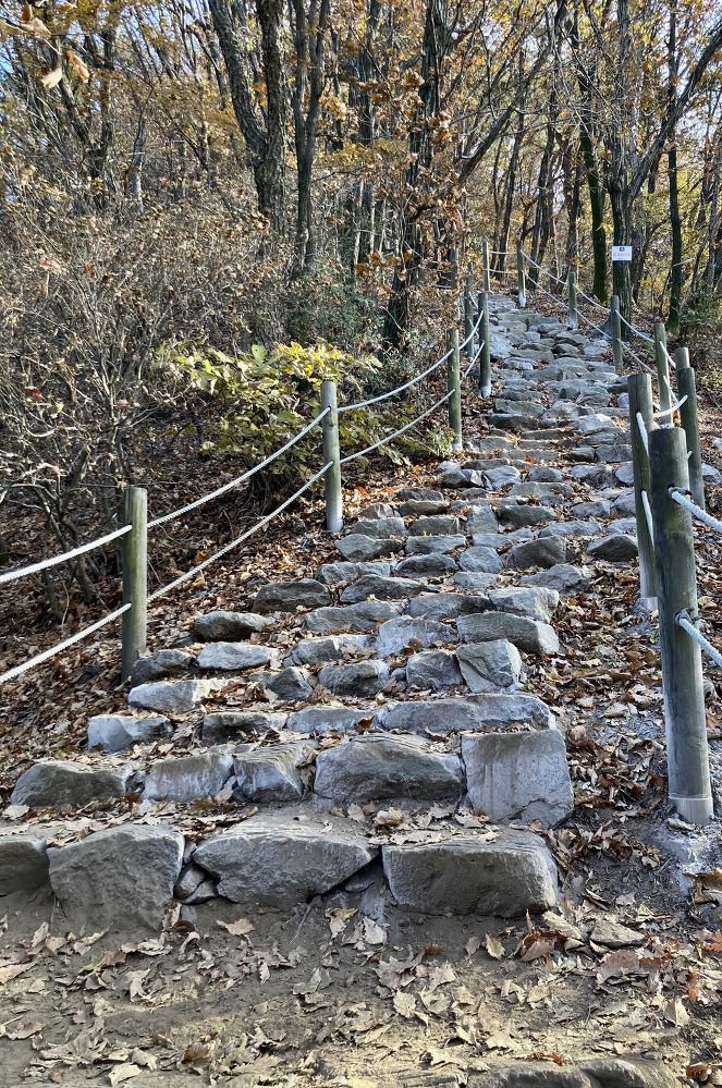 새로 돌계단을 놓은 건 아니고, 다니기 편하도록 조금 정비를 한 것 같은데, 덕분에 새 길처럼 보였다. 산에 다니다 보면 일년에 두어 번 이렇게 등산로와 주변을 정비하는 장면을 만날 때가 있다. 어떤 해는 작업하는 건 못 보고 정비와 공사가 끝난 길을 걸을 때도 있다. 삽과 곡괭이에 기계장치들도 보이는데, 이런 수고 덕분에 등산객들이 편하게 산을 오를 수 있는 것 같다.