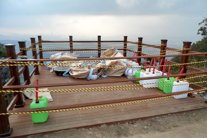 10월 초에 검단산을 오르니 정상에 등산로를 정비하기 위해 입산을 통제한다는 작은 현수막이 걸려 있었다. 검단산 정상엔 전망 데크가 두 개 설치돼 있는데, 하나는 양평 방향으로, 다른 하나는 서울 방향을 둘러보게 돼 있다. 그 중 서울 방향 데크에 링처럼 줄을 둘러 놓고 안에는 20리터 들이 물통 십여 개와 자재들이 놓여 있었다.
