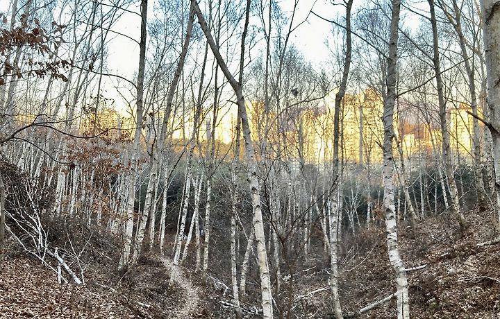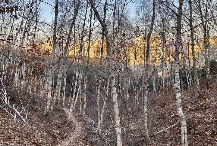 지난주에 덕풍골 약수터 둘레길을 걷다가 자작나무 군락지에 이르렀다. 조금 더 가까이에서 관찰하고자 숲 안쪽으로 들어섰는데, 때마침 자작나무들 뒤에 서 있는 아파트 단지로 오후의 햇빛이 반사되고 있었다. 불타 오른다거나 강렬한 빛은 아니었지만, 이 시간대가 아니었다면, 또 날씨가 받쳐주지 않았다면 쉬 구경할 수 없는 제법 장엄한 풍경이었다.