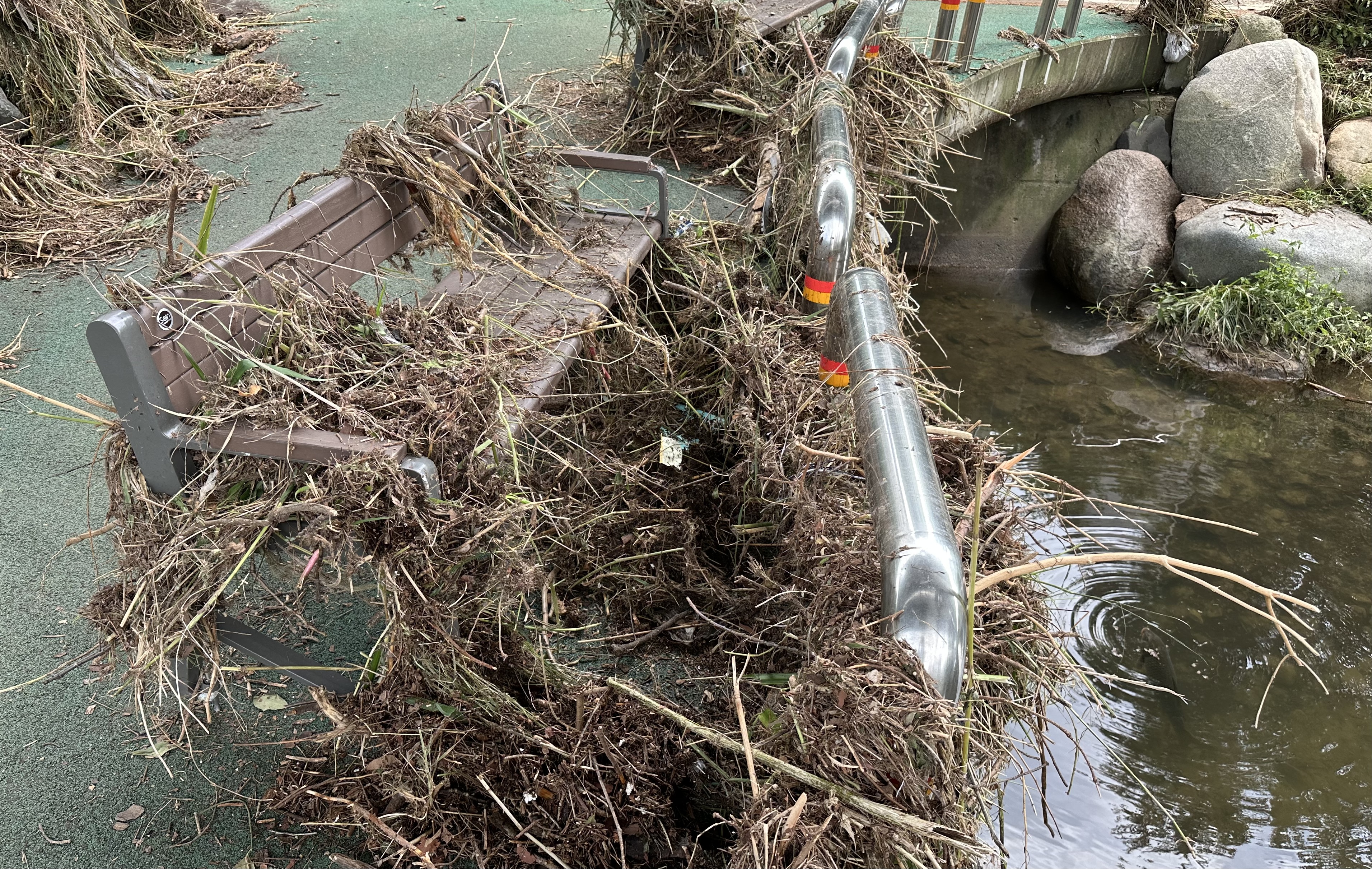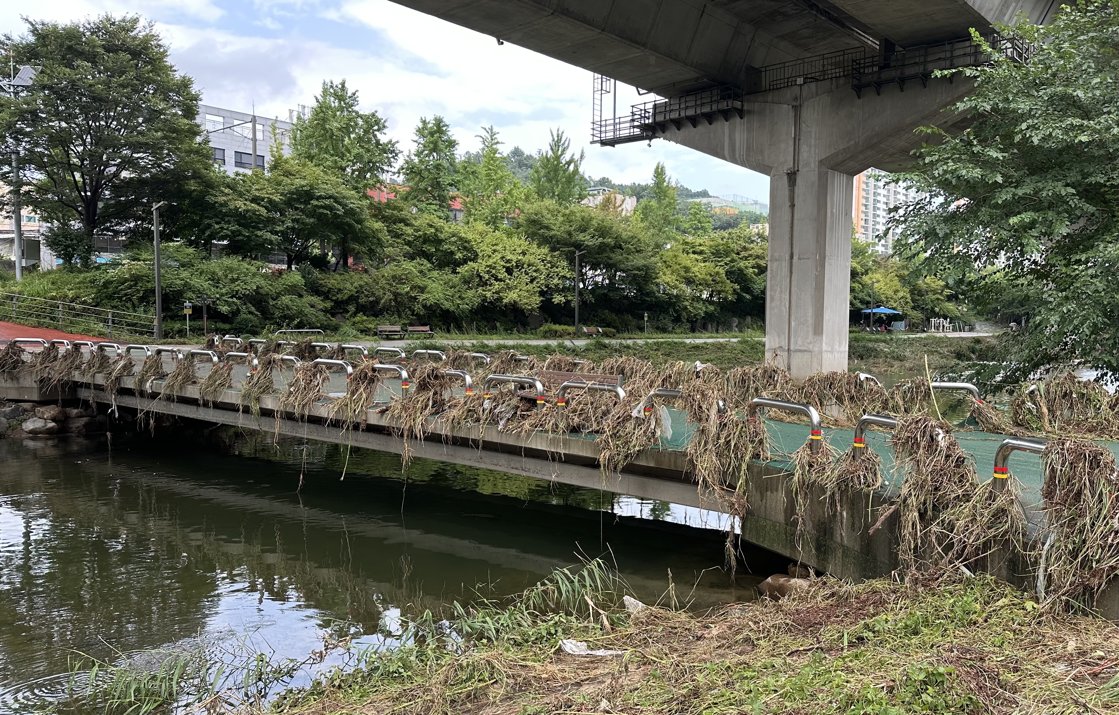 비가 오기도 많이 왔겠지만, 상류 쪽으로부터 무섭게 흘러내려와 다리 위까지 얼추 2미터 높이를 이루던 물이 한강으로 빠져나간 후 남은 흔적들이었다. 그 옆 벤치 위 아래에도 어지럽게 엉켜 쌓여 있는 걸 아직 치우지 못했는데, 때마침 다른 동네에서 와서 가볍게 동네 구경하려던 방문객 눈에 띈 것이다.