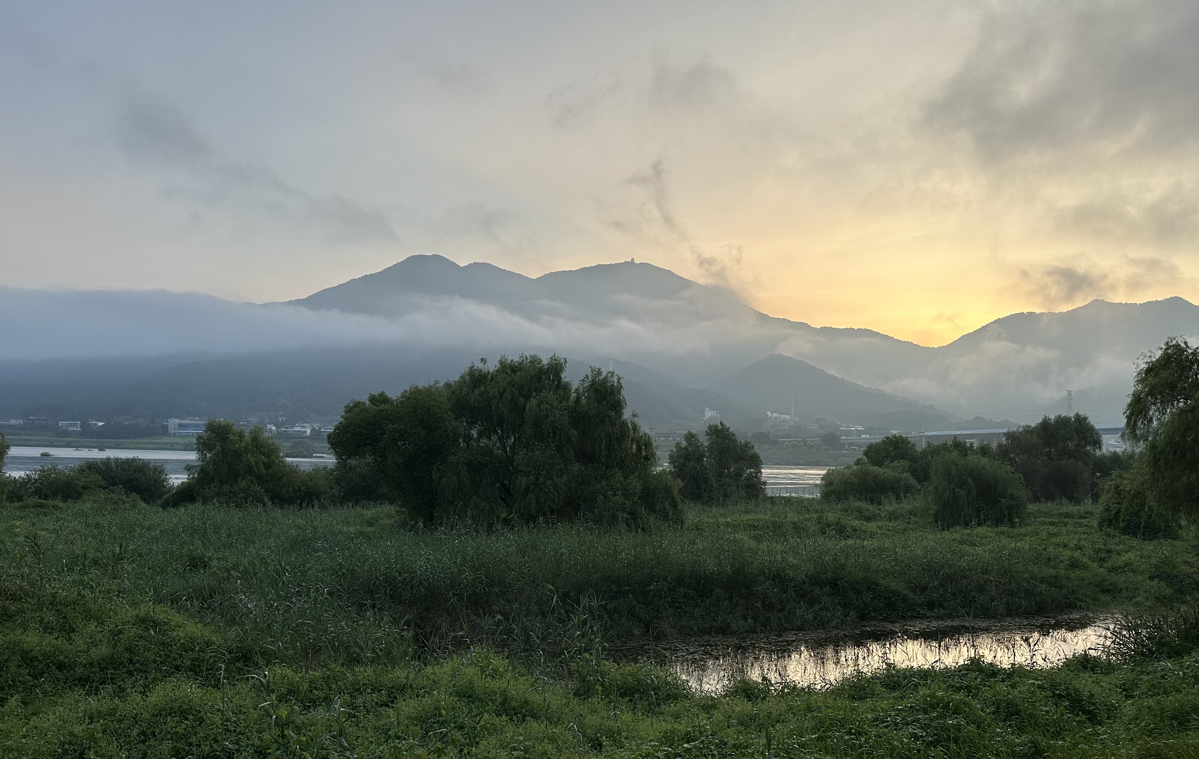 오랜만에 동이 막 터오르는 시간에 집을 나섰다. 대단한 일출까진 아니어도 예봉산 허리에 물안개까지 둘러서 제법 볼만한 풍경이었다. 강 건너엔 산줄기들이, 팔당대교가 지나는 한강과 습지들이 한 눈에 들어온다. 생각 같아서는 거의 매일같이 같은 시간대에 나와서 변화하는 계절의 풍경을 잡아내고 싶지만, 월간에서 주간 정도로 간격을 좁히는 게 우선이다.