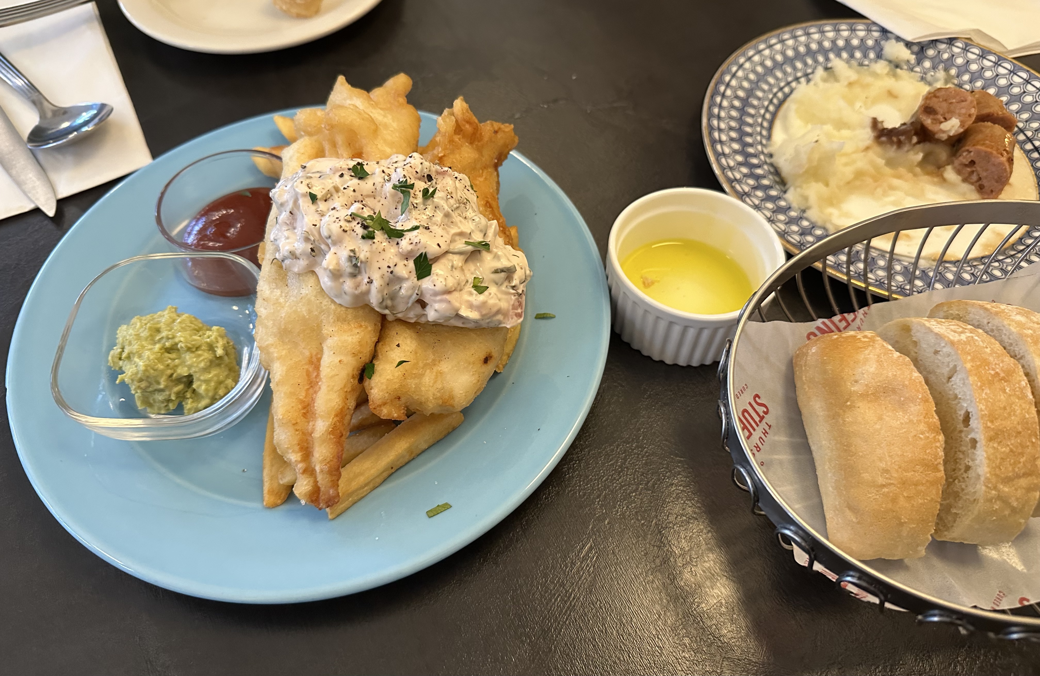 피쉬 앤 칩스엔 완두콩 후무스와 타르타르 소스가 나왔고, 반씩 자른 미니 양배추와 잘게 썬 베이컨을 오븐에서 구워낸 요리, 부드러운 감자퓨레와 함께 나온 소세지, 그리고 오렌지 향이 나는 감자 퓨레와 렌틸 샐러드 위에 올린 오리 다리 콩피는 하나같이 근사하고 그럴듯했다.