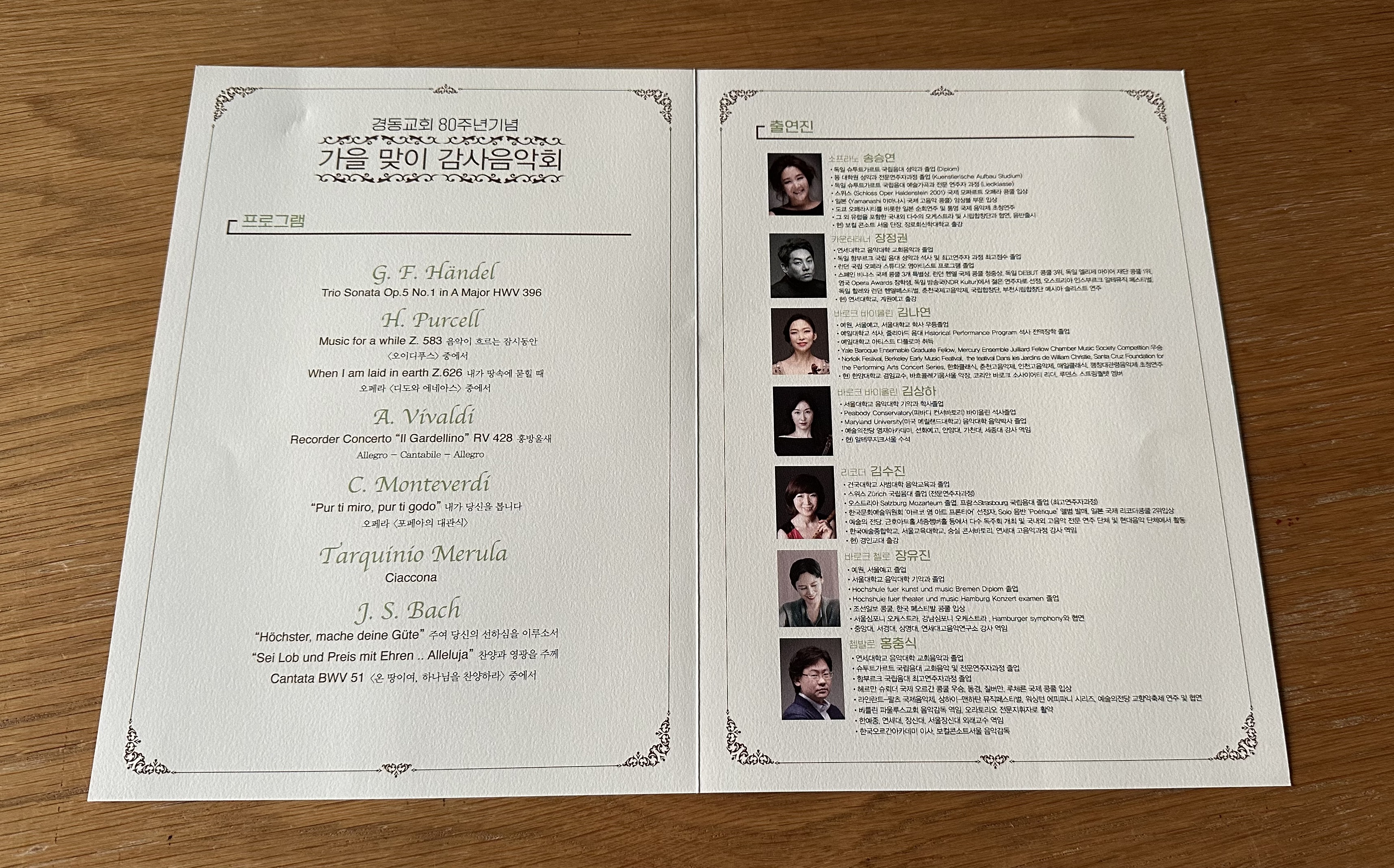 주일 오후 교회에서 바로크 음악 연주회가 열렸다. 쳄발로와 바로크 바이올린, 바로크 첼로, 리코더 등 고악기 연주자와 소프라노, 카운터 테너가 출연하는 단출하지만 고풍스러운 음악회였다. 비발디와 헨리 퍼셀, 바흐와 헨델의 선율을 눈앞에서 실감할 수 있었다.