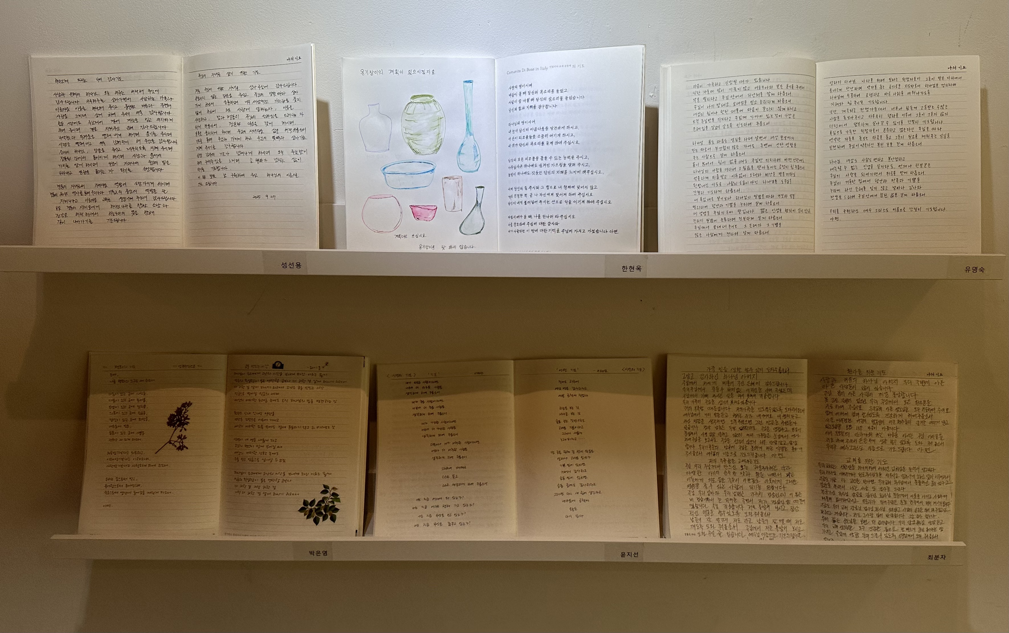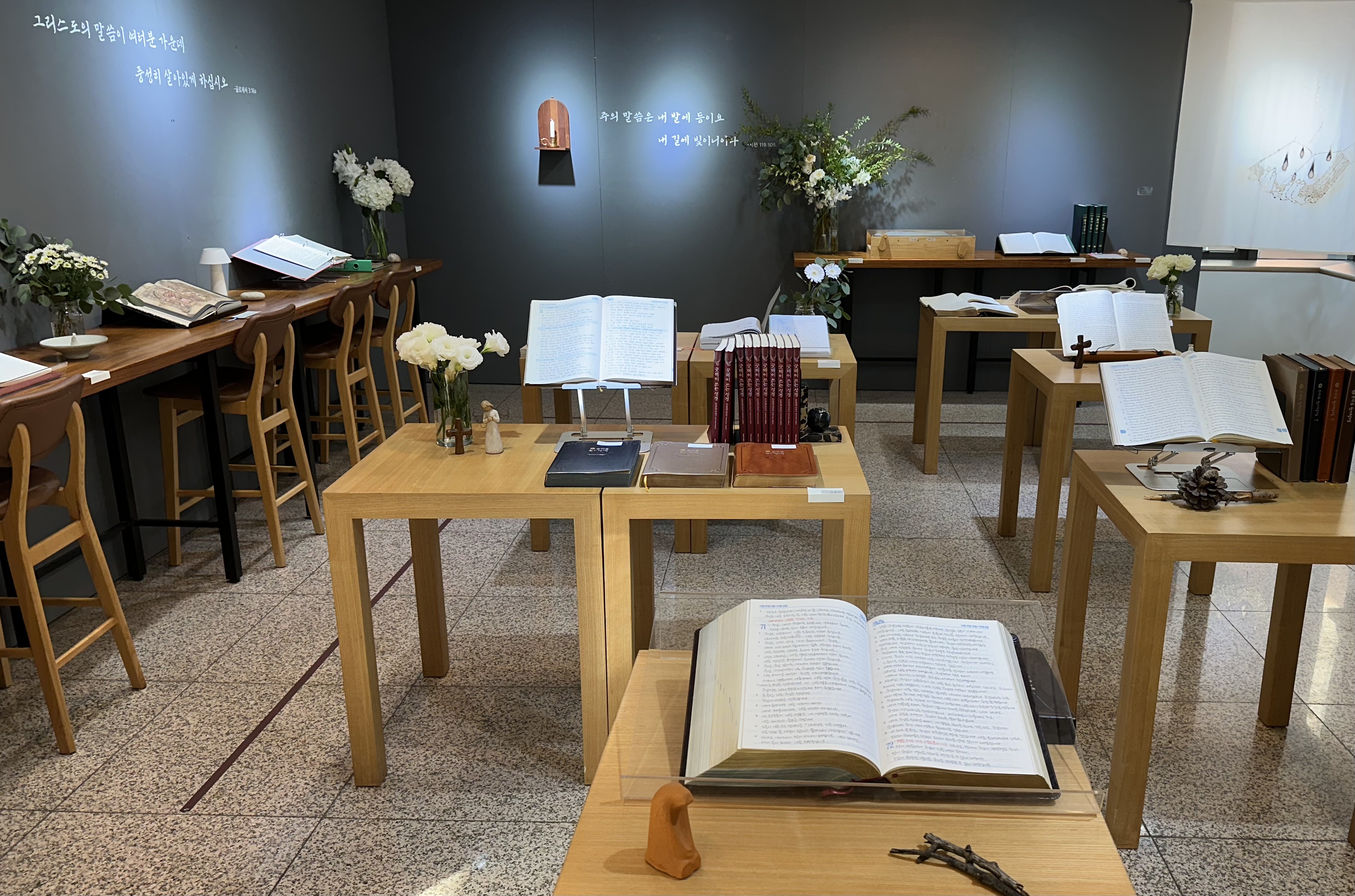 교회에 갤러리 공간이 있어 매달 테마를 바꿔가며 전시회가 열려 예배 후 점심 먹고 들려서 구경하는 재미가 있다. 11월 한 달 간은 교우들의 성경, 찬송, 시 등 손글씨 필사전 <샬롬을 쓰다>가 열린다. 몇 달 전 노트를 한 권씩 배부하면서 필사를 장려했는데, 그 중 제출한 이들의 수십여 작품이 전시됐다.