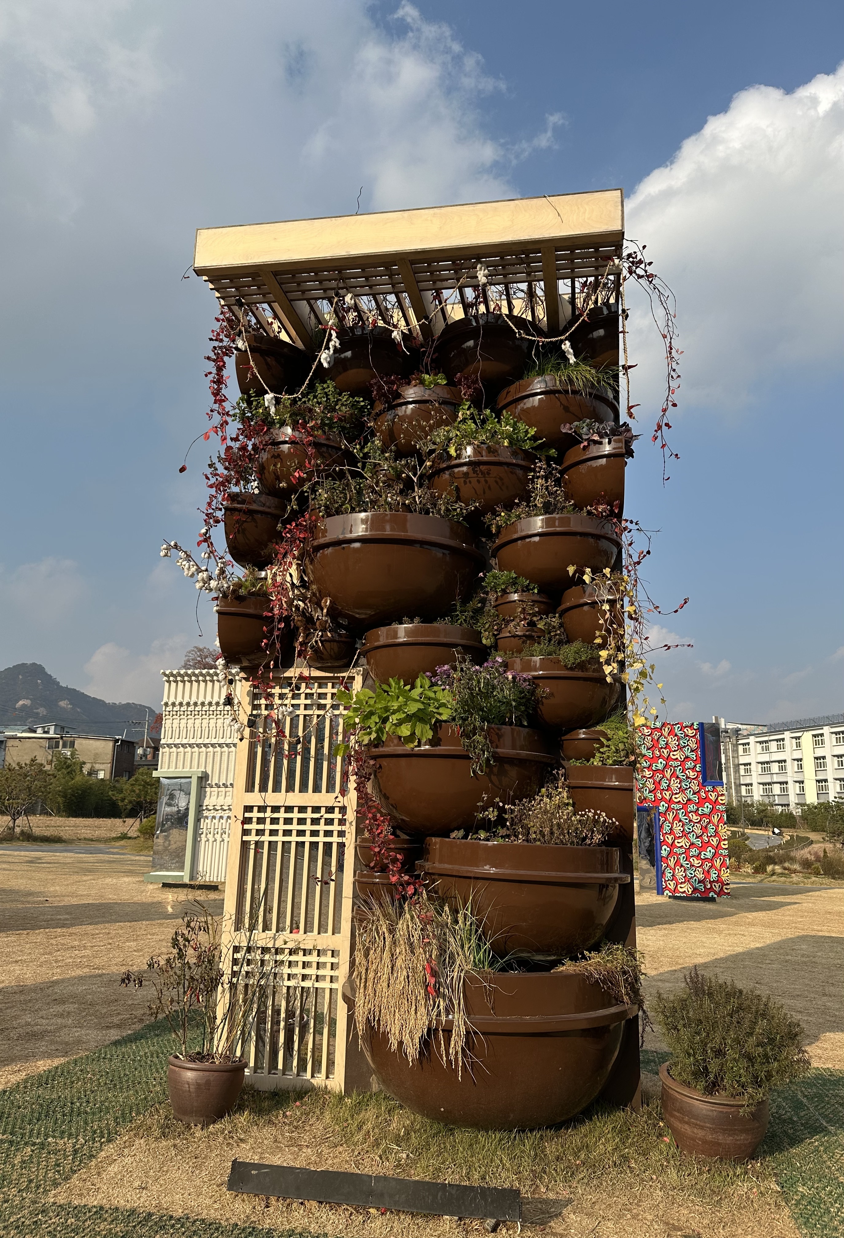 '일상의 벽' 24개가 군데군데 설치된 것도 보기 좋았는데, 그 중 커다란 도기 가마솥 화분을 쌓아올린 요리사 에드워드 리의 <살아 있는 레스토랑>과 <광창>이란 문짝이 느낌 있게 다가왔다. 우리 전통 대문 위로 난 이국적인 창과 문양들이 절묘하게 어울려 존재감을 느끼게 했다.